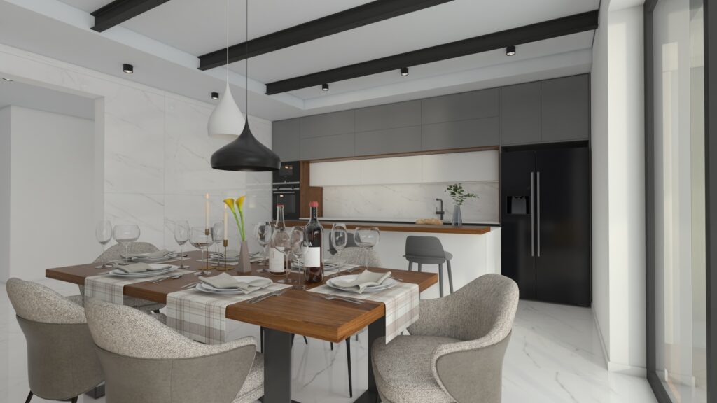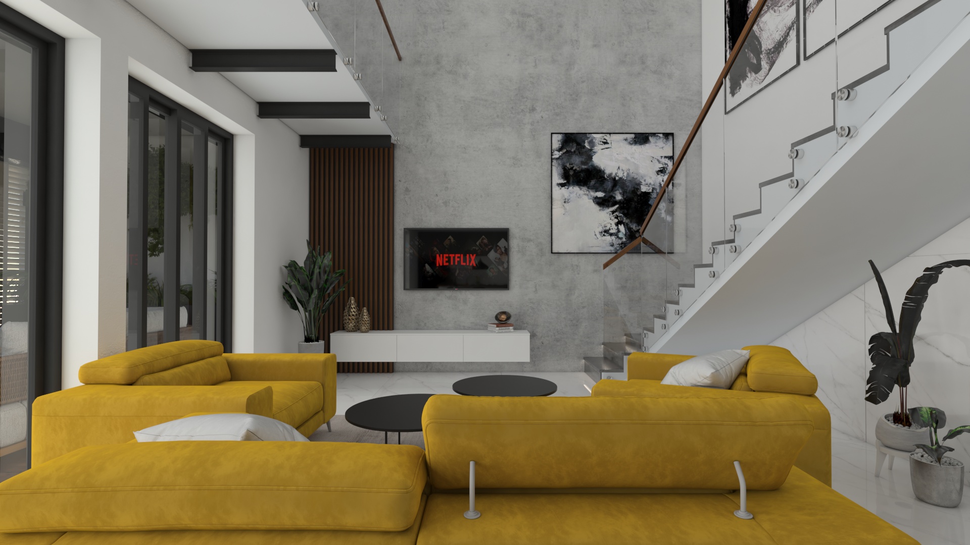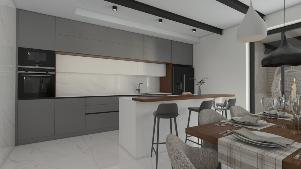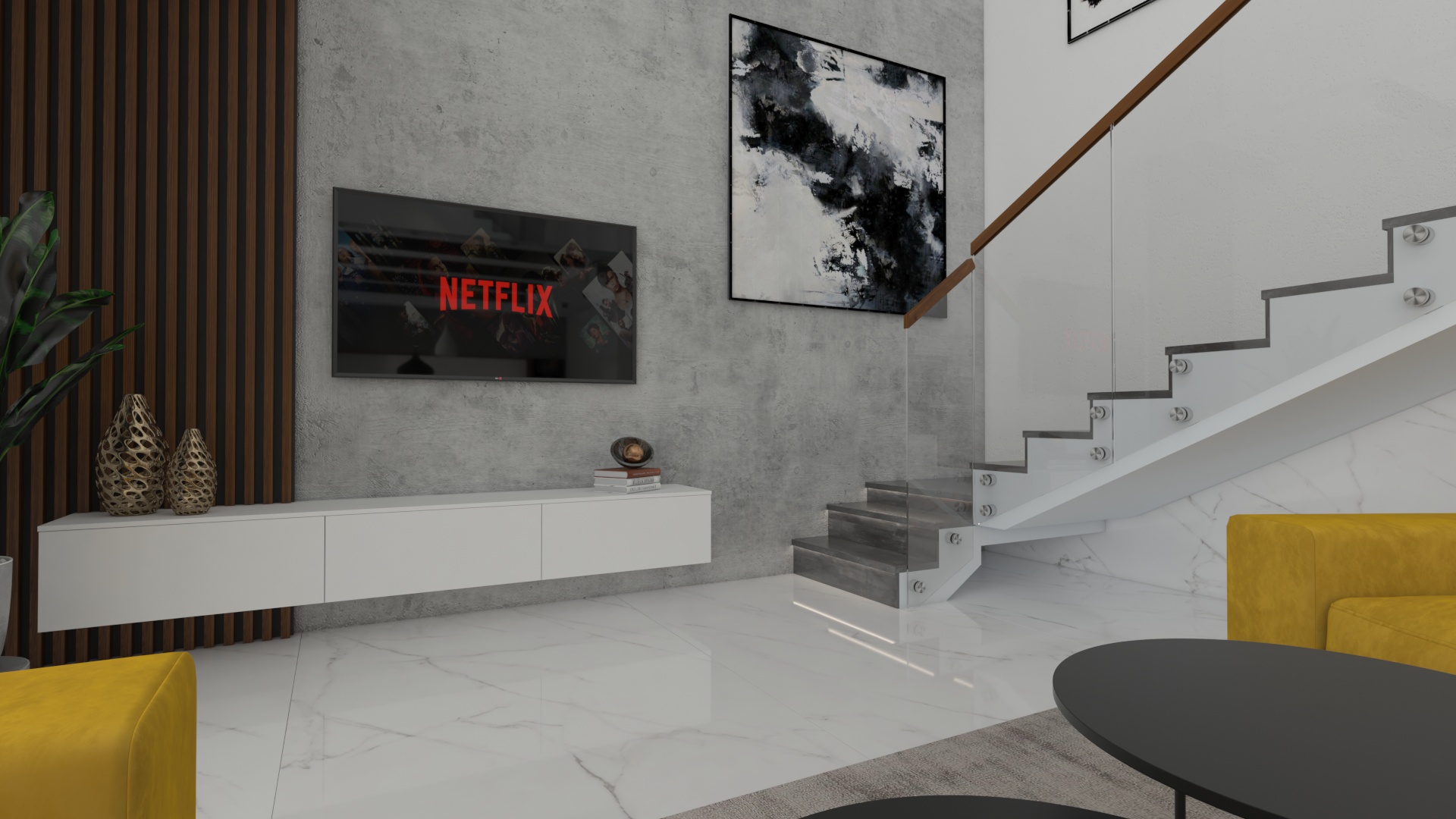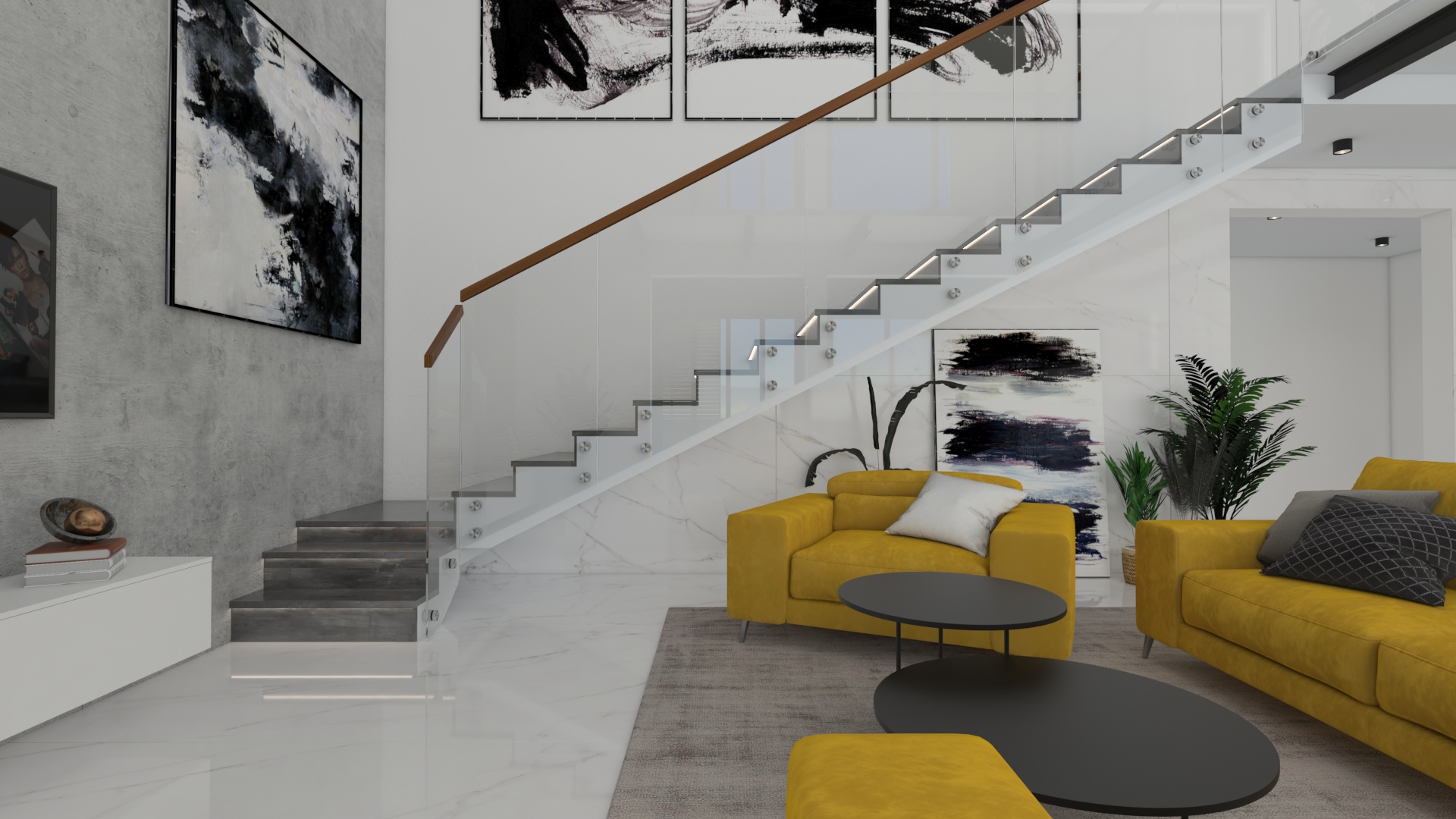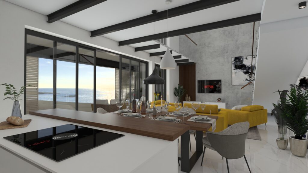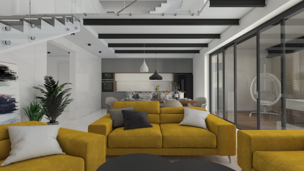 Dizajnový návrh hlavného priestoru apartmánového domu pri mori sa nesie v elegantnom duchu. Veľkoformátová mramorová dlažba v kombinácií s čiernymi doplnkami pôsobí veľkolepo, no zároveň si interiér vďaka jednoduchým nábytkovým formám ponecháva minimalistické črty. Kombinácia sivej a teaku, dreviny typickej pre Chorvátsko vytvárajú v interiéri príjemný kontrast. Celý priestor sme oživili sedačkou výraznej horčicovej farby.