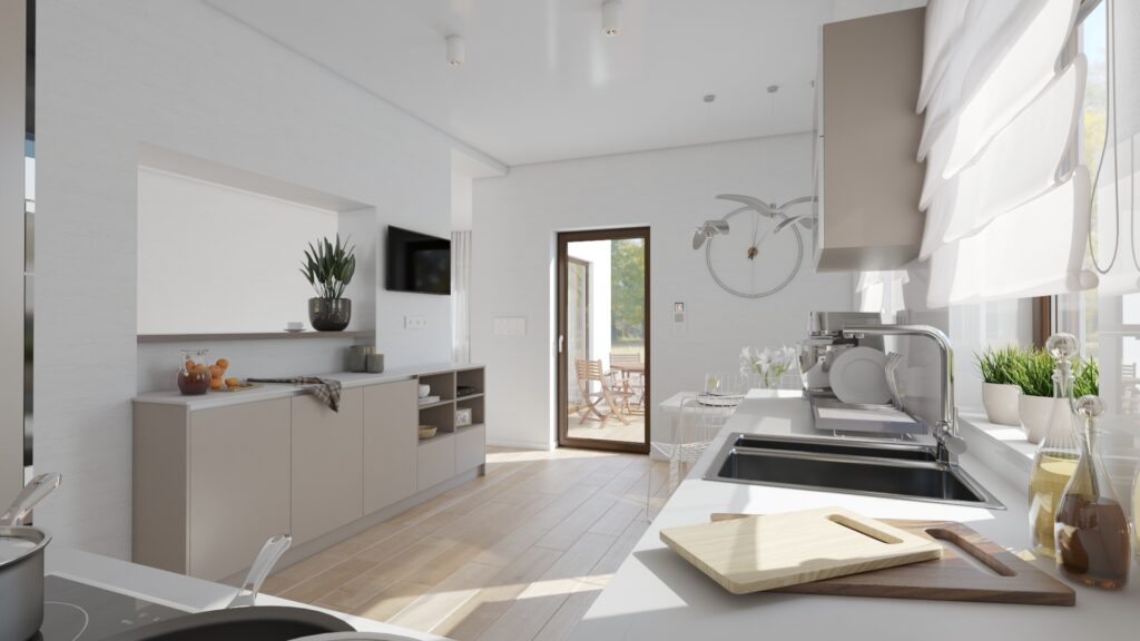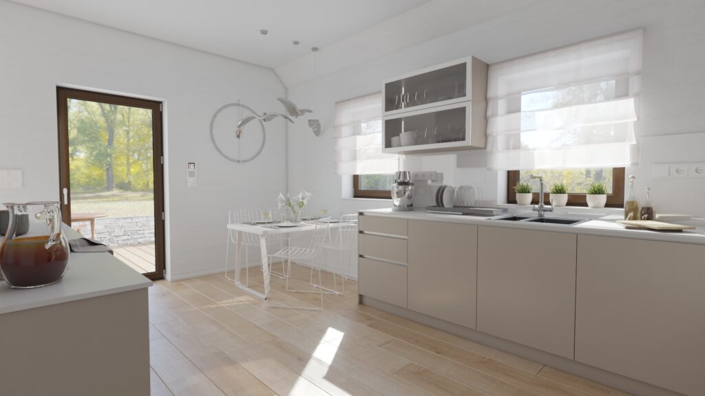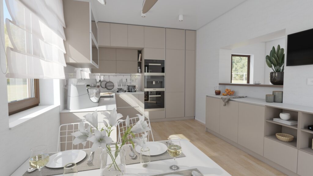 Návrh kuchyne do rodinného domu v Myjave je navrhnutý tak, aby splňoval všetky požiadavky na dostatočný úložný priestor, jednoduchý a praktický dizajn. Veľký dôraz bol kladený na ľahkú údržbu použitých materiálov, preto sme zvolili pracovnú dosku z umelého kameňa od firmy CORIAN. Kuchyňa je ladená do obľúbených svetlých zemitých tónov s jemnými kontrastmi. Celkový dizajn pôsobí veľmi príjemne, moderne a minimalisticky.