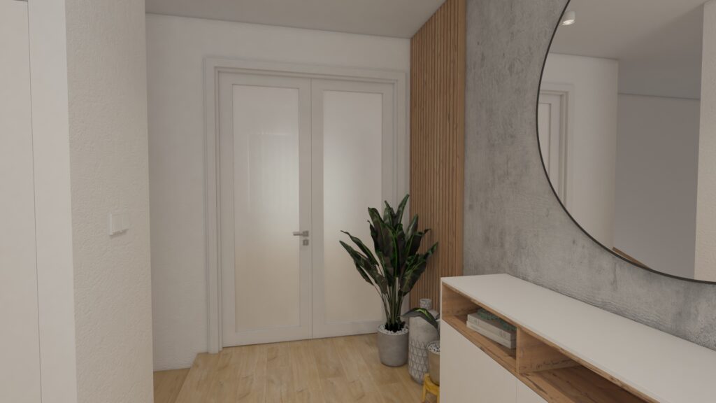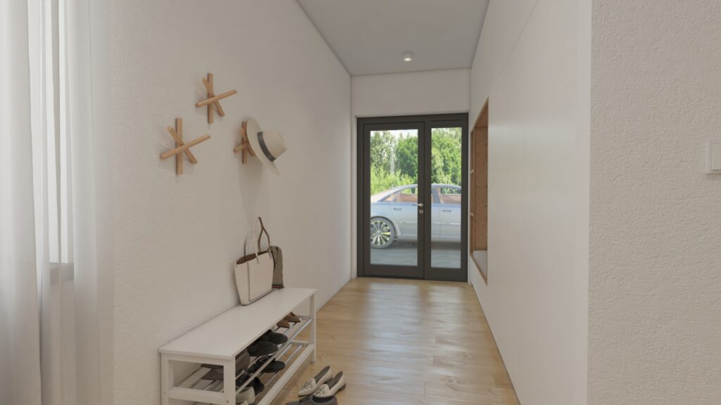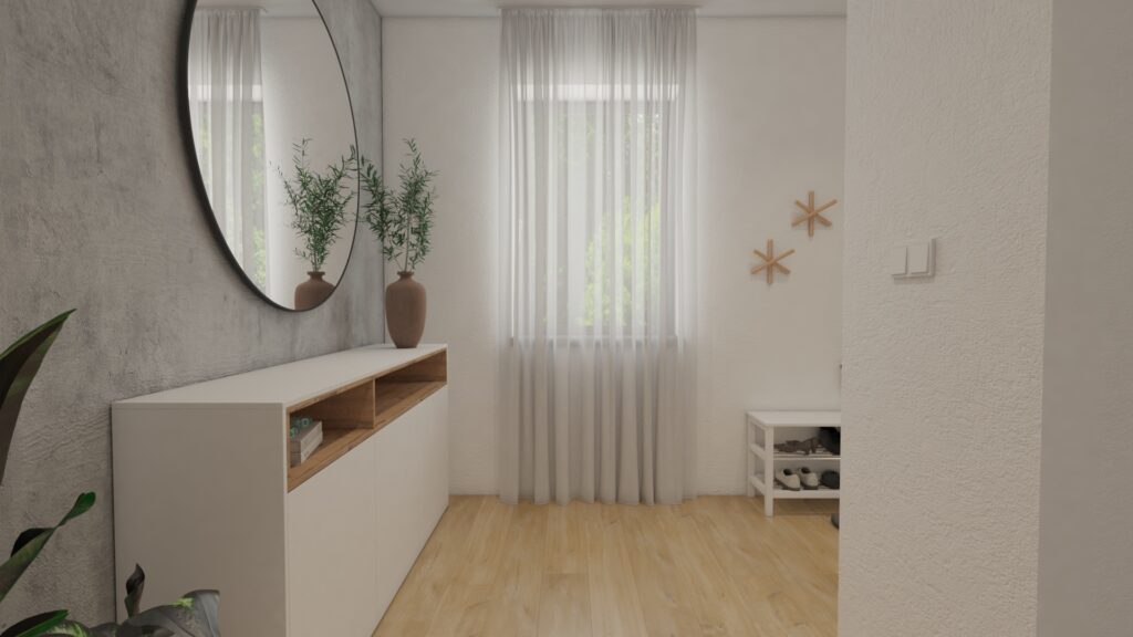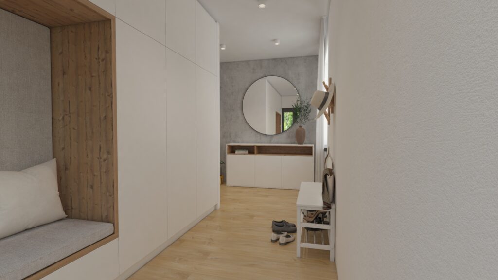 Návrh vstupnej haly v rodinnom dome sa člení na 2 časti. Prvú časť tvorí nábytková zostava s dostatkom úložného priestoru pre zavesenie šatstva. Druhú časť tvoria prvky ako lamely, komoda a veľké zrkadlo, ktoré spolu tvoria jeden celok.